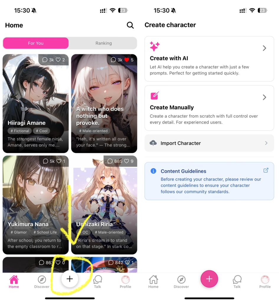 Tap the “+” button in the bottom-right corner of the app → Go to the character creation screen → Follow these 8 steps in order: